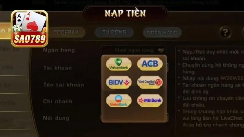 Hướng dẫn nạp rút tiền Sao789 an toàn, nhanh chóng